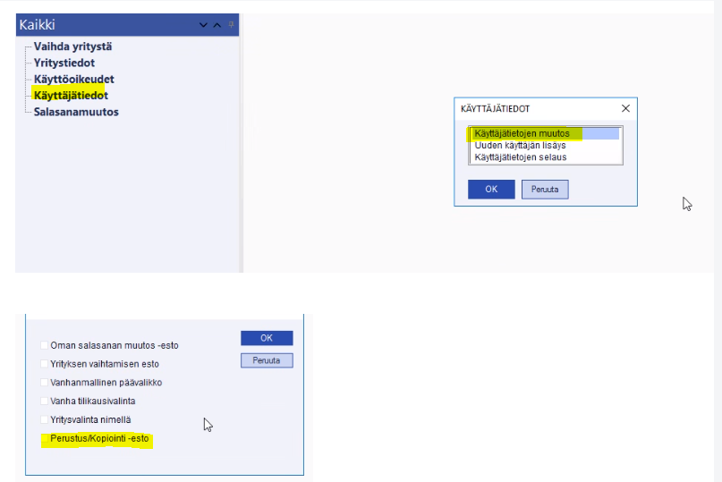 - Käyttäjätiedot → Käyttäjätietojen muutos → Valitse käyttäjä → Poista ruksi kohdasta Perustus/Kopionti-esto