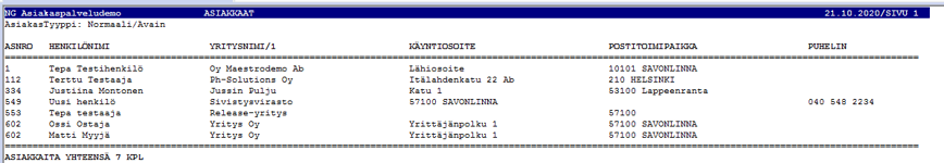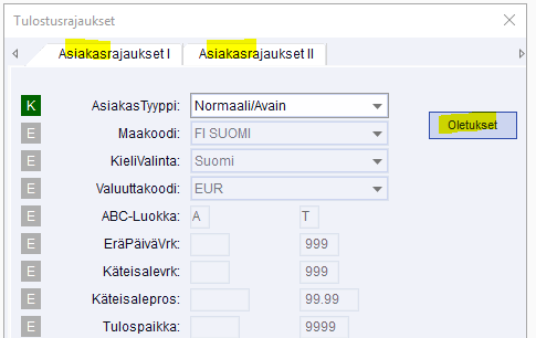 Tehdään tarvittavat Asiakasrajaukset I ja II tai tehdään rajaukset Oletuksilla, jolloin hakee kaikki aktiiviset Normaali/Avainasiakkaat: