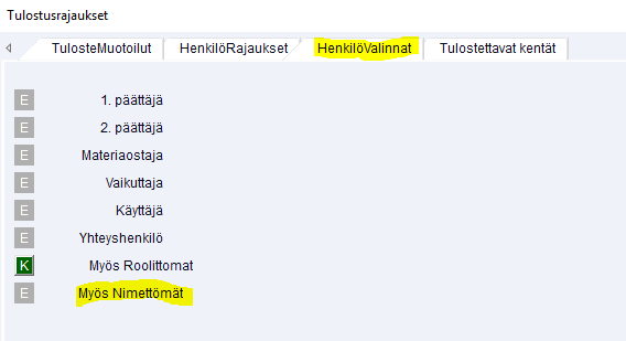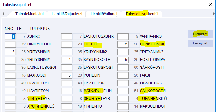 Kun henkilövalintaan on laitettu rajaus, Tulostettavissa kentissä kannattaa ottaa vähintään Oletukset käyttöön, jolloin henkilönimi tulee mukaan selaukselle. Kuvassa merkityt sarakkeet liittyvät yhteyshenkilöihin, joita voi myös lisätä selaustulokseen: