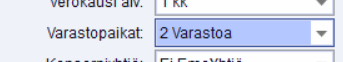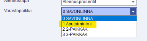 5. Laskua tehdessä myynnillä ehdotetaan Varastopaikka -kohdassa oletuksena 0 varastopaikkaa, eli pääyritystä. Jos lasku halutaan tehdä aputoiminimellä, varastopaikka-kenttään vaihdetaan 1-paikkakunta niille myynneille, jotka halutaan laskuttaa aputoiminimellä. Valinta tulee siis tehdä joka kerta erikseen