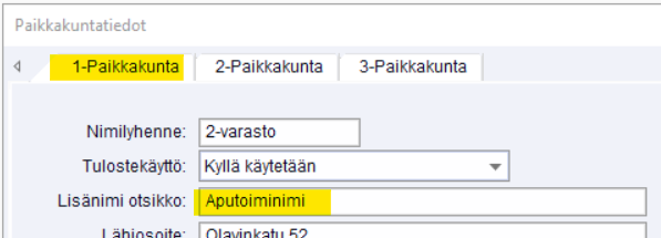 2. Määritetään aputoiminimen tiedot perusrekisterit - paikkakuntatiedot - 1-paikkakunta -kenttään, Lisänimiotsakkeeseen.