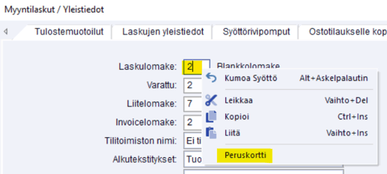 Määritys tapahtuu Tiedosto - asetukset - Myyntilaskut - yleistiedot - ohjelmakohtaiset tiedot -välilehdellä, painamalla F10 tai hiiren oikeaa -> lomakenumero -kentässä numeron vieressä - ja avautuvasta valikosta Peruskortti: