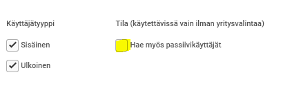 Huom. Jos haet passivoitua käyttäjää ja haluat aktivoida tunnuksen, haku kentässä sinun tulee laittaa valinta kohtaan "Hae myös passiivikäyttäjät"