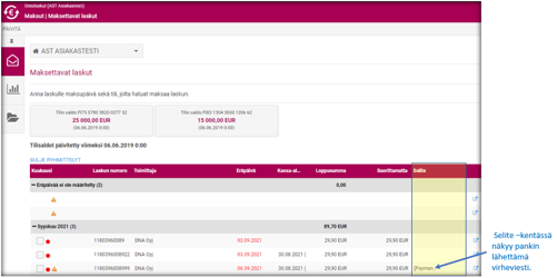 Jos maksu jää pankissa jostain syystä virheeseen eikä maksu mene pankissa läpi, palautuu lasku takaisin Maksettavien laskujen listalle.