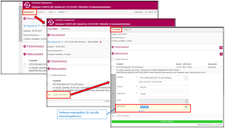 Klikkaa Lisää maksutieto ja syötä maksutiedot laskulle. Huomioi laskun maksupäivä. Maksupäivä ei voi olla menneisyydessä.