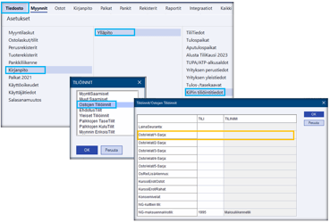Tiedosto - Kirjanpito - Ylläpito - KiPin tiliöintitiedot => Ostojen tiliöinnit => ostovelkatilit