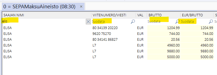 Jos otat selauksen selaustaulukkoon, saat etsittyä maksuja selaustaulukon suodatustoiminnoilla: