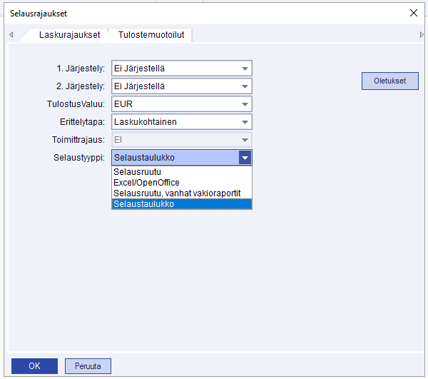 Tulostemuotoilut-välilehdellä voit halutessasi järjestellä hakutuloksen esim. toimittajittain. Lisäksi selaustyypin valikosta voit valita mihin haluat selauksen tulostuvan eli selausruudulle, selaustaulukkoon tai Exceliin/OpenOfficeen.