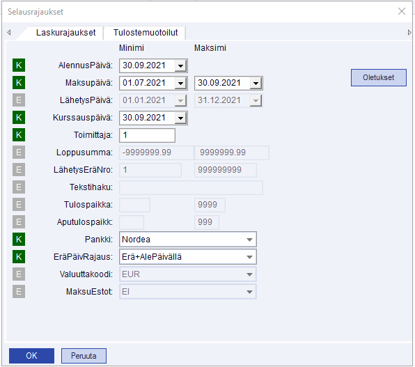Laskurajaukset-ikkunassa voit rajata hakutulosta esimerkiksi maksupäivän, toimittajan ja maksupankin mukaan: