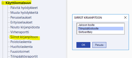 Käyttöomaisuus - Siirrot kirjanpitoon - Tilinpäätöstosite