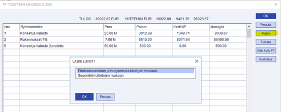 Ohjelma laskee poistot. Ehdotettujen poistojen määrää pääset muokkaamaan Poisto-kentässä. Ruudun yläreunassa olevassa Tulos- kentässä näet muutosten vaikutuksen tulokseen. Hyväksy lopuksi muutokset OK:lla.