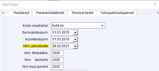 Jos lukitulle kuukaudelle täytyy tehdä korjauksia, vaihda käyttöomaisuuden yleistiedoista Viim. JaksoTosite päivämääräksi edellisen kuukauden loppupvm:
