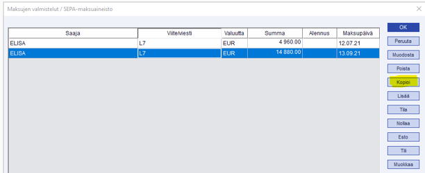 Valitaan pankkiliikenteen avoimista maksuista lasku, joka halutaan maksaa osasuorituksena (esimerkissä 14 880,00 euroa). Valitaan joko Kopioi-painike tai painetaan F4: