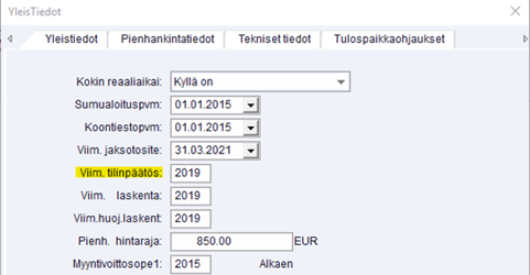 Tämän jälkeen avataan tilikausi vaihtamalla käyttöomaisuuden yleistietoihin viimeisimmän tilinpäätöksen tilikausitunnus (alla olevan kuvassa vuosi 2020 avataan vaihtamalla Viim. tilinpäätös-kenttään vuosi 2019):