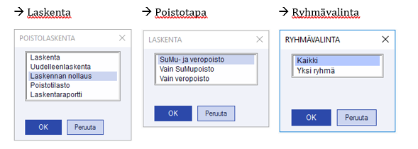 Käyttöomaisuus -> Poistolaskenta (molemmat laskennan erikseen) -> Laskennan nollaus
