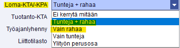 Kertyvät eurot tulevat niistä palkkalajeista, joille on palkkalajille merkitty Loma-KTA/-KPA valintaan joko Tunteja + rahaa tai Vain rahaa:
