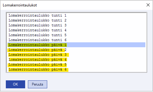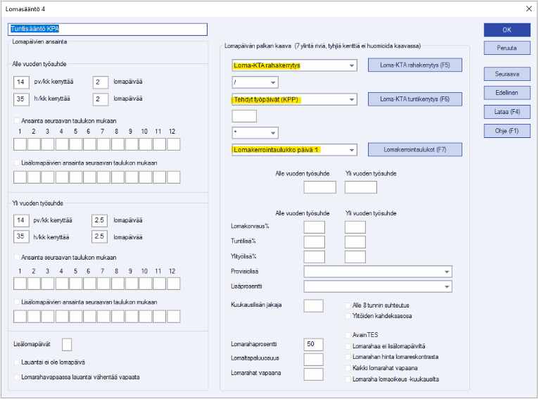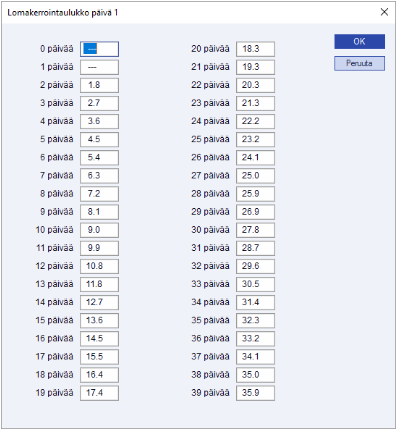 Kertoimeen voidaan valita joko vuosilomalain mukaiset kertoimet, jotka löytyvät Lomakerrointaulukko päivä 1 -valinnan takaa, tai sitten voidaan tarpeen mukaan muokata jollekin päiväsäännöistä sopivat kertoimet. Kertoimet saadaan auki lomasäännöllä joko painamalla F7 tai klikkaamalla Lomakerrointaulukot (F7) -painiketta: