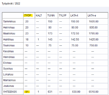 Päiväpalkan jakajana käytetään palkanlaskennasta kertyviä työpäivä, eli niitä, jotka näkyvät palkansaajan henkilökortin erikoistoimintojen Työpäivät-ikkunassa: