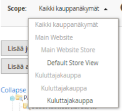 Mikäli käytössä on useampi verkkosivusto niin Scope: Kaikki kauppanäkymät valikon alta voi vaihtaa halutun sivuston kauppanäkymän käyttöön ja tarkistaa sieltä kauppanäkymäkohtaiset toimitustavat.