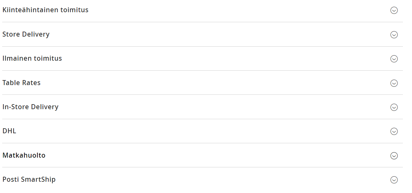 Verkkokaupan toimitustapoja muutetaan hallintapaneelissa kohdassa Kaupat - > Asetukset - > Konfigurointi - > Myynti - > Delivery Methods. Käytössä olevat toimitustavat ovat verkkokauppakohtaisia, joten toimitustapa valikon väkästä avaamalla näkee mitä toimitustapoja on otettu käyttöön verkkokaupassa.