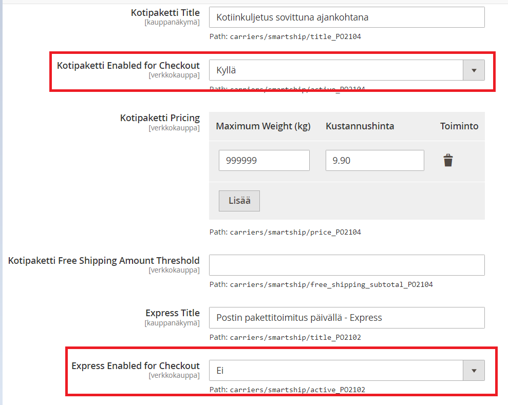 Toimitustapa otetaan käyttöön / poistetaan käytöstä toimitustavan Käytössä /Enable for checkout valikosta. Muissa toimitustavoissa on vain tuo yksi valinta toimitustavan kanssa, mutta Matkahuollon ja Postin toimitustapavalikon alla on toimitustapakohtaisesti mikä toimitustapa on käytössä. Tuo valinta löytyy aina toimitustapaotsikon alta