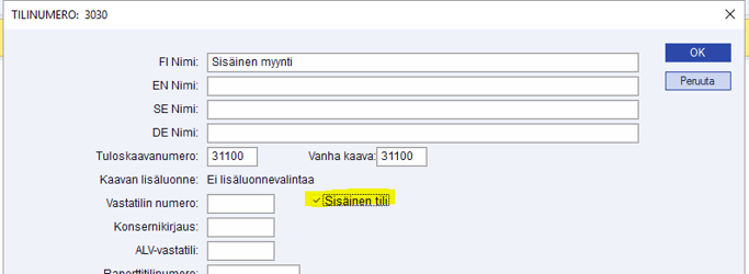 Maestron kirjanpidossa voidaan hyödyntää tarvittaessa sisäisiä kirjanpidon tilejä. Sisäiset tilit otetaan käyttöön määrittelemällä tilikortille tili sisäiseksi tiliksi: