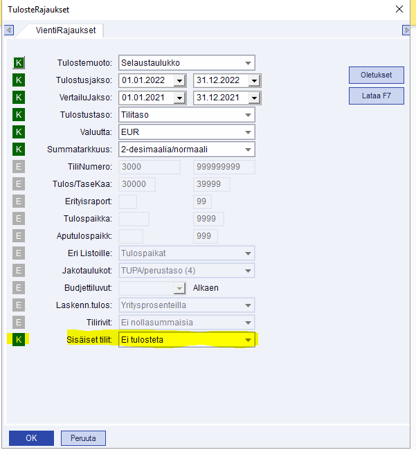 - Tulostetaan vain sisäiset tilit - Tällä valinnalla selauksiin otetaan mukaan vain sisäiset tilit.