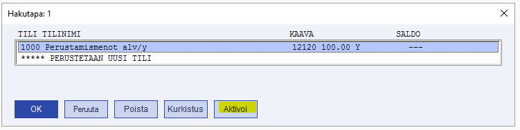 Passivoitujen tilien listalta tilin voi aktivoida uudelleen valitsemalla halutun tilirivin, ja valitsemalla Aktivoi.