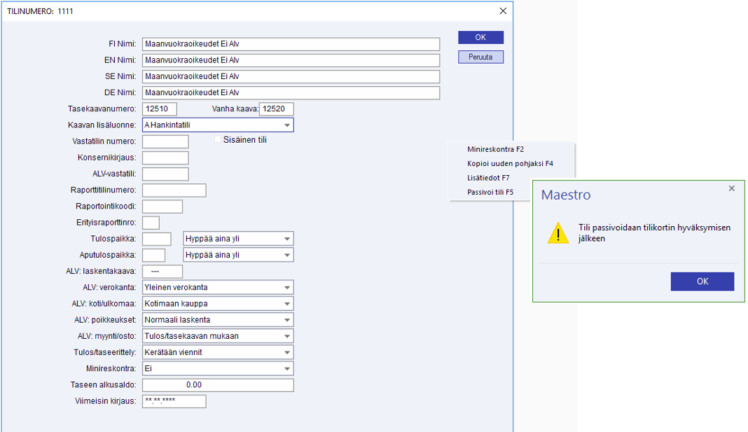 Kirjanpidon tilikortti on mahdollista passivoida. Passivointi tehdään joko tilikortilla tai tilien hakutuloksessa. Passivointi/Aktivointi tilikortilla tehdään hiiren oikealla avautuvasta valikosta valitsemalla Passivoi tili F5 / Aktivoi tili F5, tai painamalla tilikortilla F5. Tili passivoituu, kun tilikortti suljetaan. Valinnalla Peruuta passivointia ei tehdä.