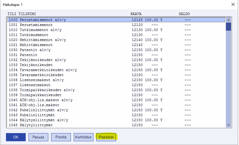 Passivointi tilihaussa tehdään valitsemalla haluttu tilirivi hakulistalta, ja valitsemalla Passivoi. Tilihaun alalaidassa näkyvät myös aiemmin passivoidut tilit, mikäli tili täyttää hakuehdot. Valinnalla Haetaan passiiveja -rivin nähdään hakuun sopivat aiemmin passivoidut tilit.