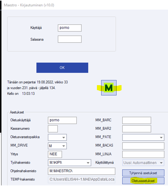 Maestron kirjautumisikkunassa painetaan M-kirjainta, jolloin avautuu näkymä, josta valitaan "oletusasetukset":