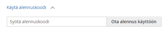 Ostoskorin hintasäännön alennuskoodit lisätään verkkokauppatilaukselle "maksutapa" - sivulla. Sivun alalaidasta löytyy "Käytä alennuskoodi" - laatikko.