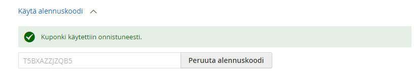 Tässä vaiheessa alennuskoodi lisätään tilaukseen alennuksen saamiseksi, mutta sen voi vielä halutessaan perua eikä sitä tässä vaiheessa vielä tulkita ns. lopullisesti käytetyksi niin ettei sitä voisi käyttää myöhemmin.