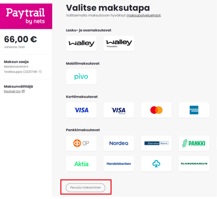 Vaikka allaolevassa vaiheessa asiakas vielä painaisi "Peruuta maksaminen" - painiketta niin tässä vaiheessa ollessa on alennuskoodi jo tulkittu käytetyksi. Samalla tavalla alennuskoodi tulkitaan käytetyksi mikäli asiakkaalla syystä tai toisesta tilauksen maksaminen ei onnistu.