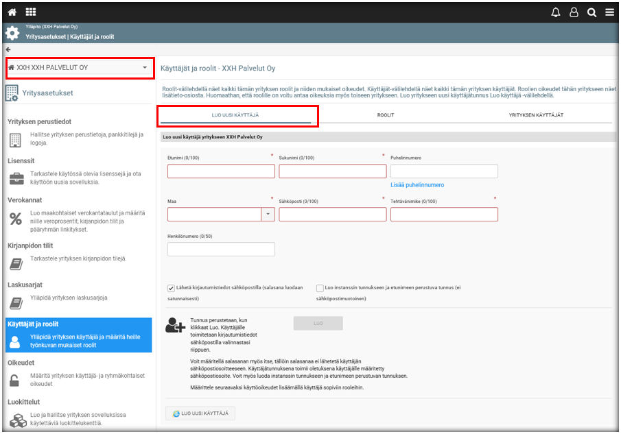 Yrityskohtaisissa asetuksissa Käyttäjät ja roolit -näkymässä valitaan LUO UUSI KÄYTTÄJÄ –välilehti.