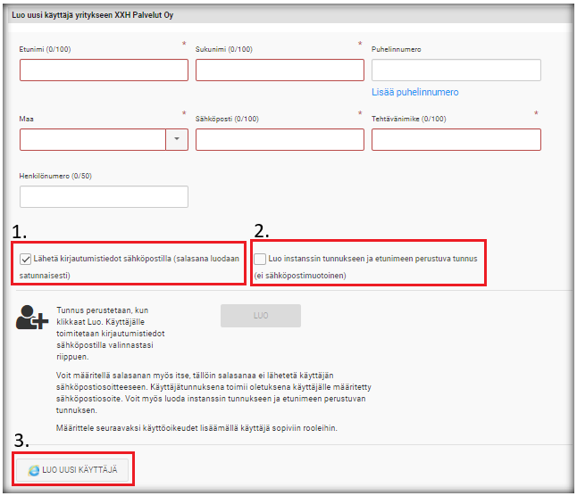 - Lähetä kirjautumistiedot sähköpostilla - Käyttäjälle lähetetään kirjautumistiedot automaattisesti sähköpostilla. Järjestelmä luo tällöin käyttäjälle satunnaisen salasanan, mutta pääkäyttäjä voit tarvittaessa päivittää käyttäjän salasanan.