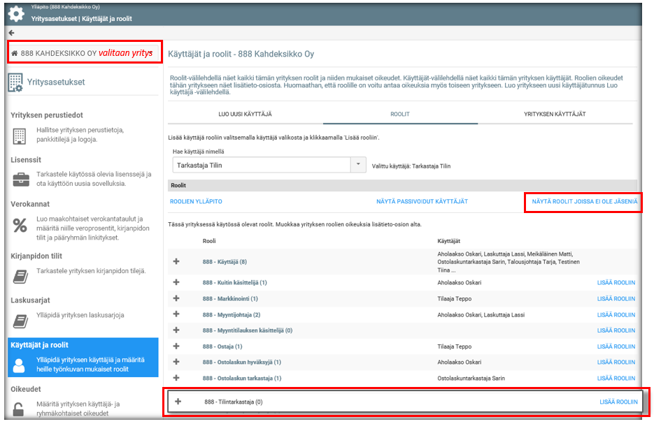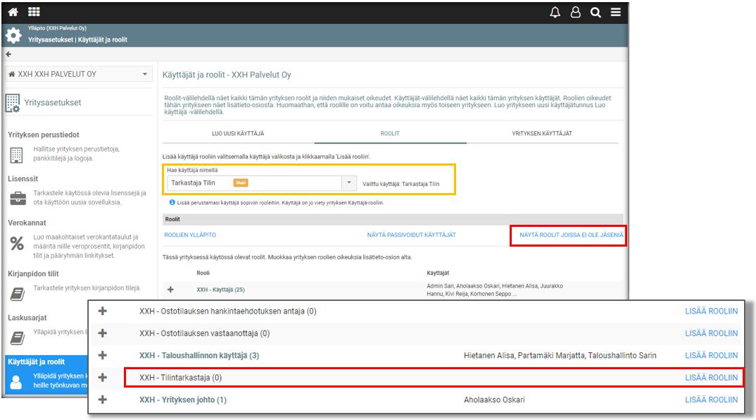 Jos tilintarkastajan rooli ei ole näkyvissä, paina NÄYTÄ ROOLIT, JOISSA EI OLE KÄYTTÄJIÄ -painiketta, jolloin rooli tulee näkyviin.