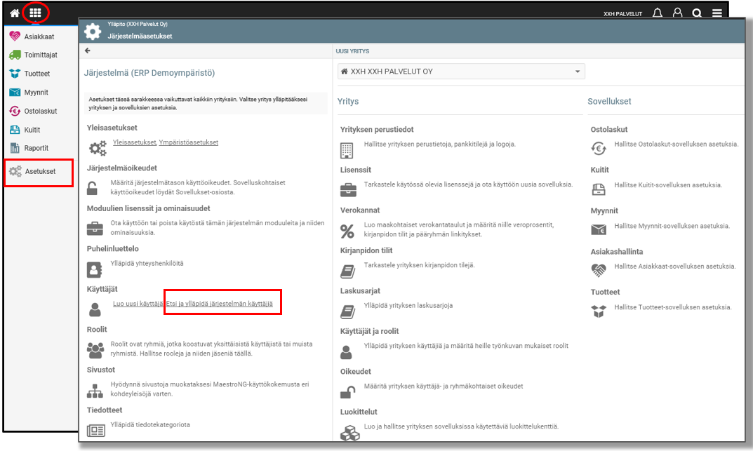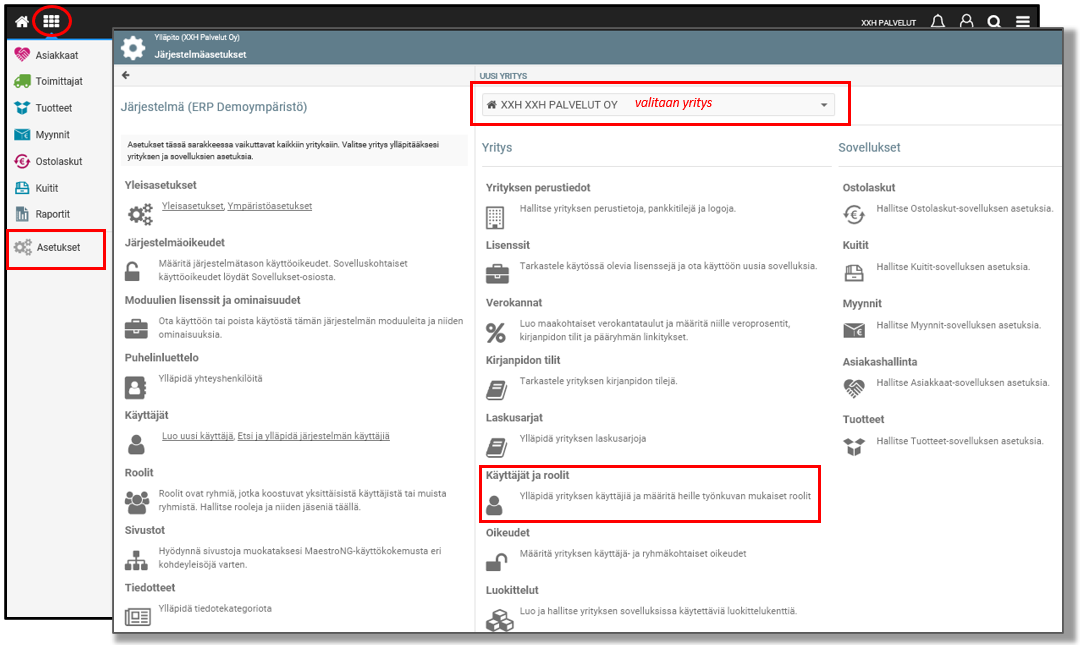 Oikeudet lisätään yrityskohtaisista asetuksista Käyttäjät ja roolit -näkymässä.