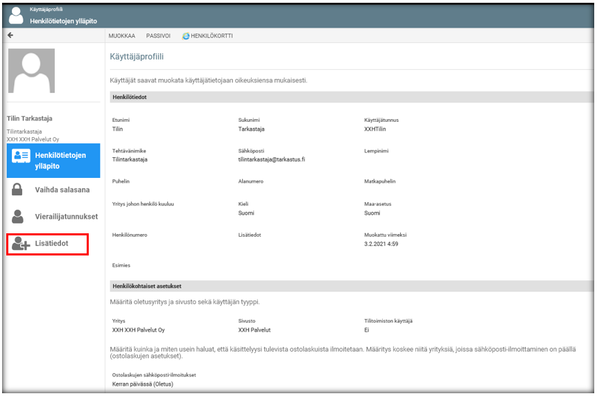 Jos tunnuksen oikeuksia tarkastellaan henkilökortin lisätiedoista, nähdään, että tunnus on saanut oikeudet tilintarkastuksen alla olevaan yritykseen.