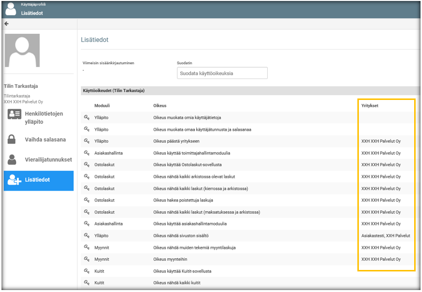 Oikeuslistauksesta selviää, mihin yritykseen tunnuksella on oikeudet.