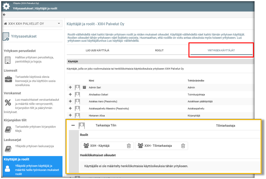 Käyttäjät ja roolit -näkymässä voi YRITYKSEN KÄYTTÄJÄT -välilehdeltä tarkastaa, miten oikeudet on tilintarkastajan tunnukselle annettu.