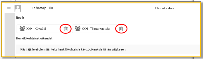 Tilintarkastajan saa poistettua yrityskohtaisista rooleista klikkaamalla roolien perässä olevasta roskakorikuvakkeesta.