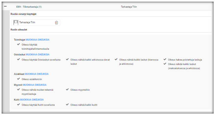 Tilintarkastajan roolin oikeuksia voi muokata sovelluksien omista asetuksista Oikeudet -kohdan alta lisäämällä tai poistamalla tilintarkastajan roolille sovelluskohtaisia oikeuksia.