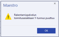 Mikäli toimitusasiakkaan kortilla ei ole Y-tunnusta ja aiot kirjata laskun Rakentamispalvelun alv:lla, ohjelma herjaa Y-tunnuksen puuttumisesta eikä päästä perustiedoista eteenpäin:
