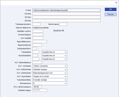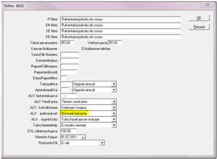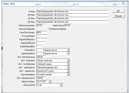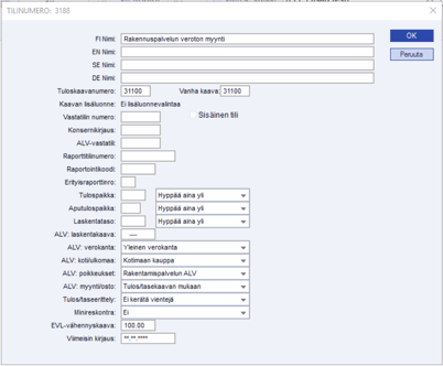 - Lisättävä uudet tilit vähennyskelpoinen rak.palv. myynti, vähennyskelvoton rak.palv. myynti, vähennyskelpoinen rak.palv. osto, vähennyskelvoton rak.palv. osto. Tilikorteille määritettävä ALV: poikkeukset –kohtaan Rakentamispalvelun ALV.