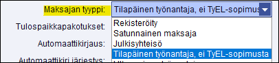 Jos Tulorekisterin virhepalautteessa lukee Temporary employer must be given as the payer type because a pension policy number (PensionPolicyNo) of a temporary employer has been given on the report, on Palkat > Tilitykset > Yleistiedot-ikkunaan syötetty TYEL-eläkevakuutusnumeroksi tilapäisen työnantajan ns. geneerinen eläkevakuutusnumero. Tällöin Tiedosto > Palkat > Yleistiedot > Yleiset yleistiedot > Maksajan tyyppi -kenttään on valittava Tilapäinen työnantaja. Jos maksajan tyyppi on Rekisteröity, on palkanmaksajalla silloin oltava oma eläkevakuutussopimus ja -numero.