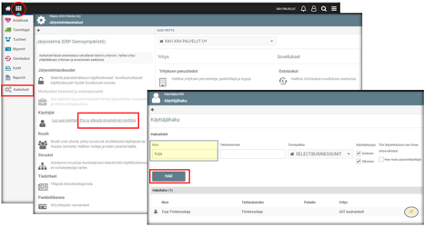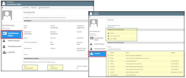 Lisätiedot -sivulta nähdään, mihin rooleihin käyttäjä on lisätty sekä käyttäjän oikeudet (eri sovelluksiin) sekä yritykset, joihin käyttäjällä on oikeuksia.