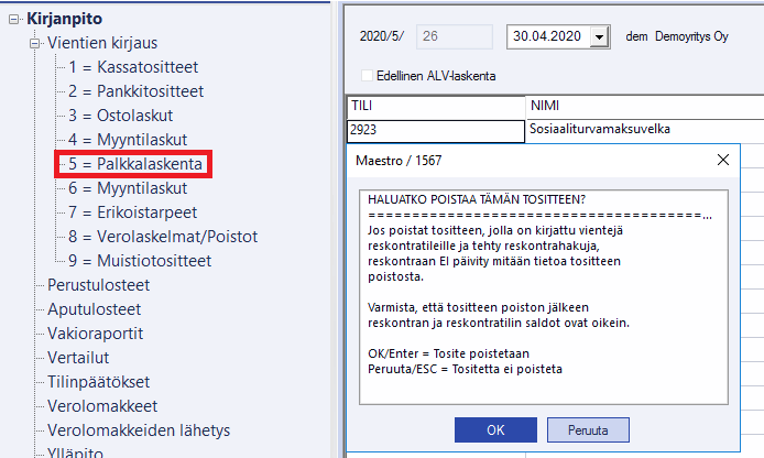 Seuraavaksi sivukululaskelma tai palkkalaskelma poistetaan palkoista ja kirjanpidosta. Poistaminen on mahdollista, mikäli kyseinen sivukululaskelma tai palkkalaskelma on viimeisin palkkakirjaus.