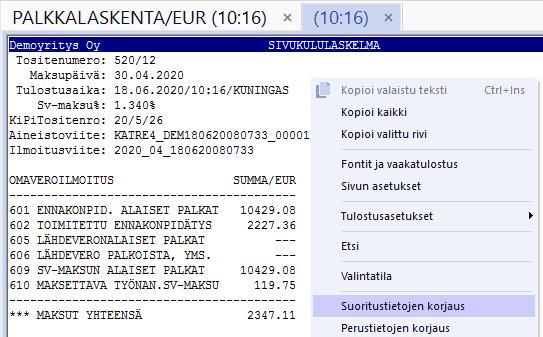 Palkkalistalta kaksoisklikataan sivukululaskelma (tai mitätöitävä palkkaerittely) auki, ja klikataan sitä hiiren kakkospainikkeella. Valitaan Suoritustietojen korjaus > Tulorekisteri: Mitätöidään.
