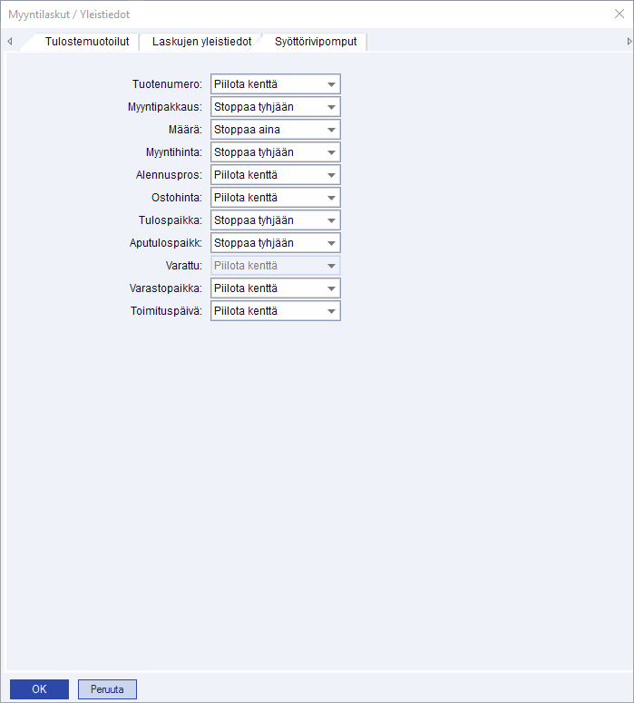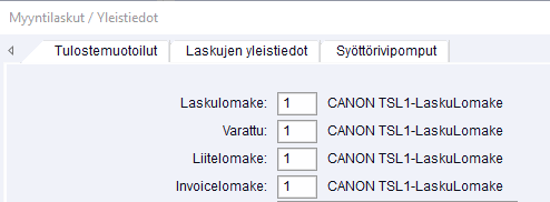 Määritä käytettävä laskulomake jokaiseen kenttään. Saat listan kaikista lomakkeista painamalla F10 tyhjässä kentässä, ja yksittäisen lomakkeen määrityksiä voit tarkastella edelleen F10:llä, kun numero on syötetty kenttään. Lomake voi olla sama jokaisessa kohdassa. Laskulomakkeet ovat moniyritysympäristön yhteisiä eli muutos yksittäiseen lomakkeeseen vaikuttaa lomakkeeseen kaikilla yrityksillä. Muut kohdat voivat olla oletusarvoisesti. Tulostemuotoilujen tarkempi kuvaus on luettavissa täällä. Laskulomakemääritysten kuvaus on luettavissa täällä.